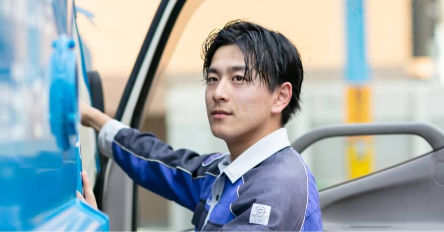 作業職は清掃車両に同乗して家庭ごみの収集を行います。地域住民の方から「おはよう」「ご苦労さま」「頑張ってね」といったお声がけをしていただけたりと生活に密着した仕事です。ごみを回収することで、地域の方々の日常を形作っている社会にとってなくてはならない仕事です。3 年ほど作業職を経験したら、資格を取得し、運転職へステップアップしていきます。