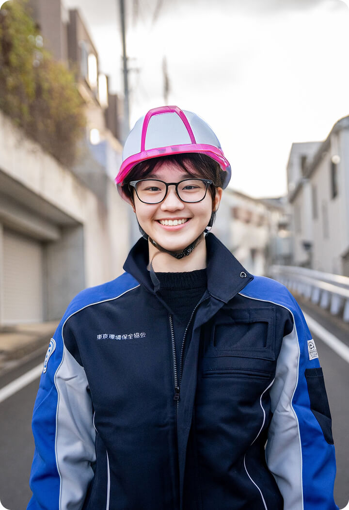 私は、現在、作業員として家庭ごみの中でもプラスチックごみの回収を担当しています。プラスチックごみは軽くて、女性でも無理なく仕事ができています。 回収をしているとごみの分別がしっかりされていない場面を見かけます。そうした場合はマンションの管理人さんにお伝えしたり、直接お話ししたりして対応しています。地域の方とコミュニケーションを取ることも大切な仕事の一つですね。